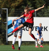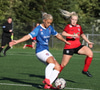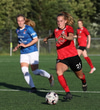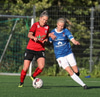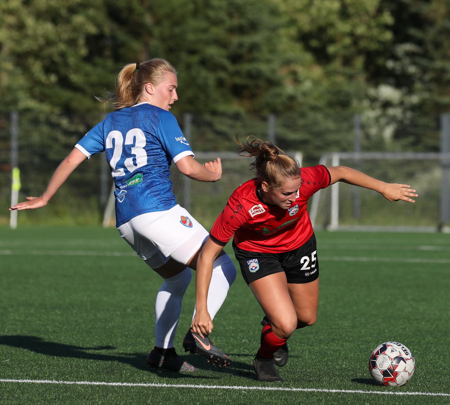 Elín Klara pressar á Evu Ýr sem reynir að koma boltanum frá og kemst í boltann sem fer þó í markspyrnu.