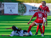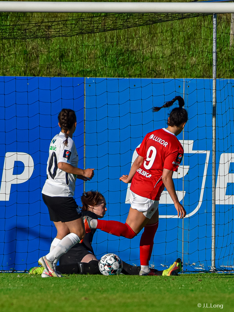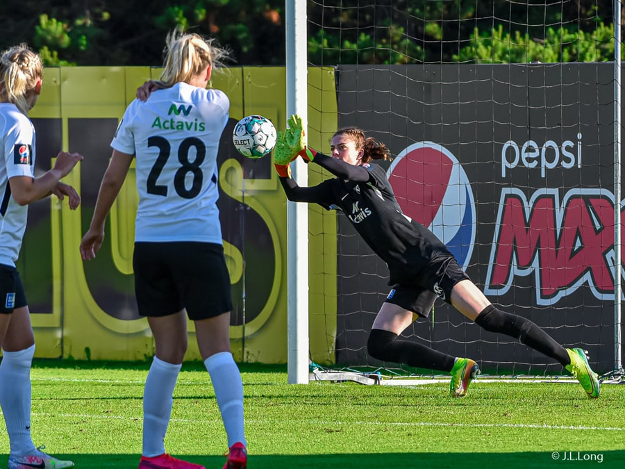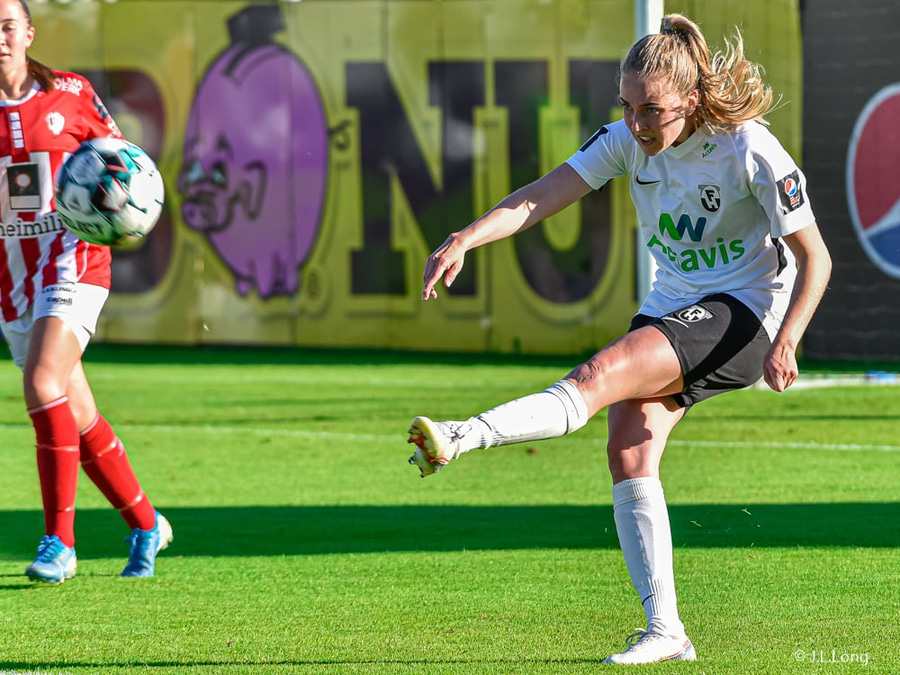 Þá er komið að Rannveigu að munda skotfótinn. Hún lætur vaða af löngu færi en skotið auðvelt fyrir Friðriku.