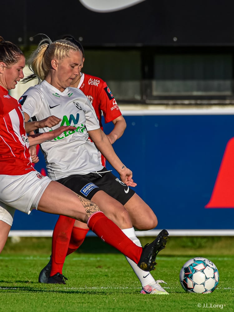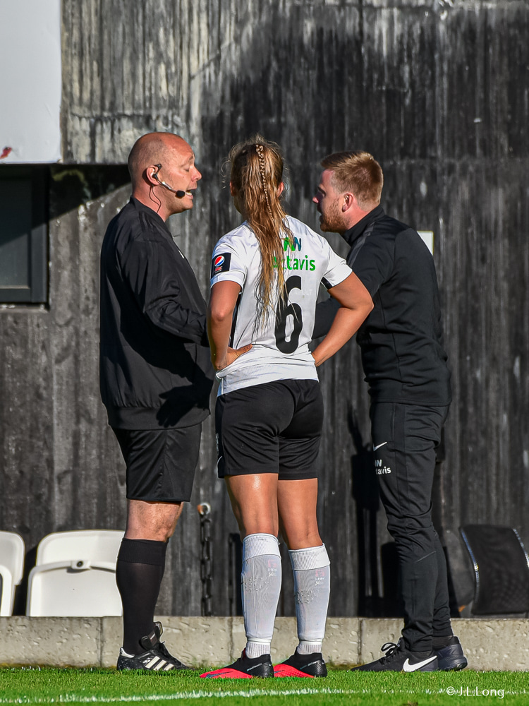 Álfhildur vinnur boltann af harðfylgi á miðjunni og sendir Stephanie í gegn en hún er réttilega dæmd rangstæð í þá mund sem hún rennir boltanum framhjá Telmu.