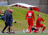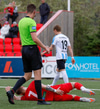 Síðasta mínúta fyrri hálfleiks. Stefán Þór liggur eftir eftir fyrirgjöf frá Haukum. Sá ekki alveg hvað gerðist en á vídeóendursýningu virðast Stefán og Tómas Leó bara hlaupa saman, óviljaverk