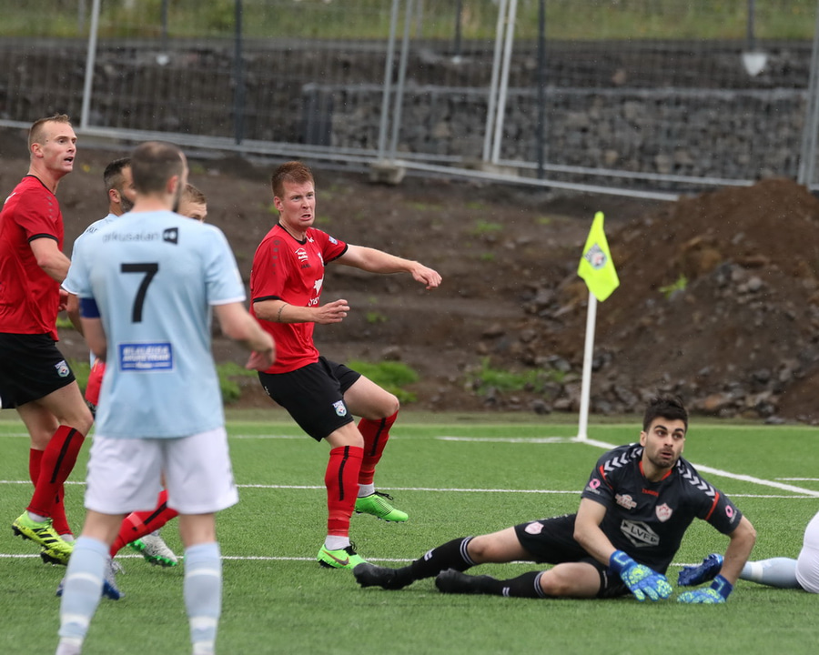 Andri líklegur en gestirnir koma honum í horn. Stutt horn sem endar á sendingu á fjær þar sem að Aron Elí nær ekki til boltans