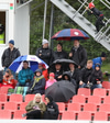 Ánægður með Leiknismanninn í stúkunni, með trommuna með sér.
