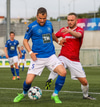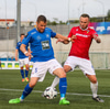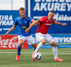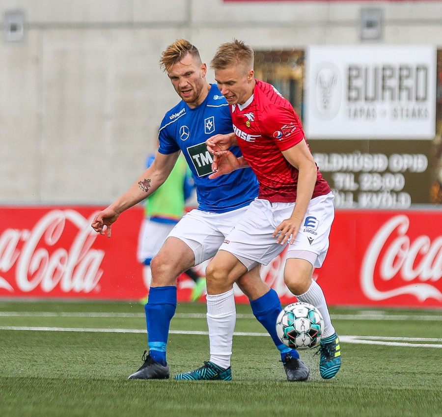 Þorsteinn Már kemur hér á hörkuspretti inní teiginn en Sebastian er vel staðsettur og stöðvar hann.