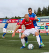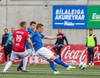 Eyjó dansar hérna framhjá þremur Valsmönnum og Haukur Páll fær nóg af því og dúndrar hann niður. Heppinn að sleppa við spjald þarna.