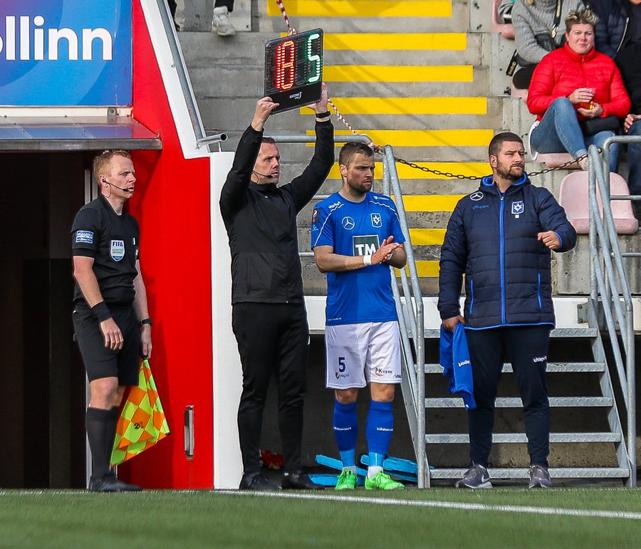 Liðin labba þá út á völlinn á eftir Pétri löggu, dómara leiksins, Alex Þór og Haukur Páll, fyrirliðar, ræða málin og allt fer að verða klárt fyrir þennan stórleik.