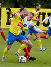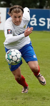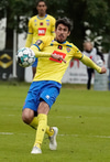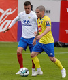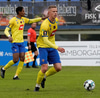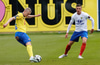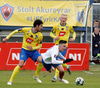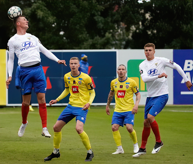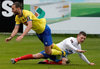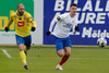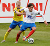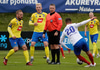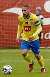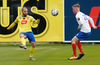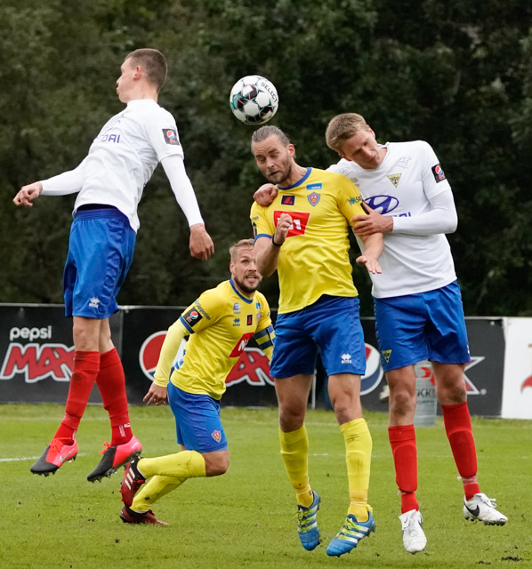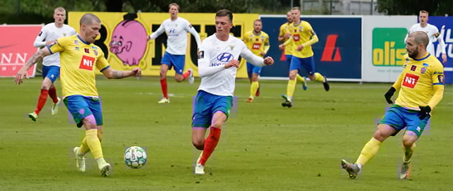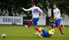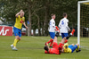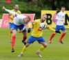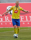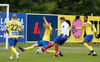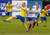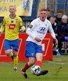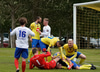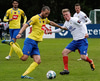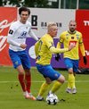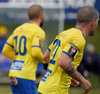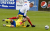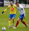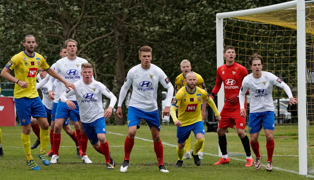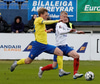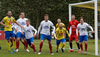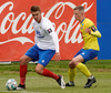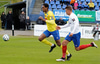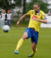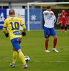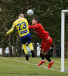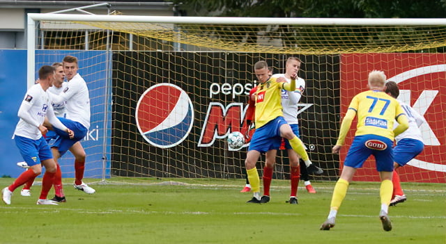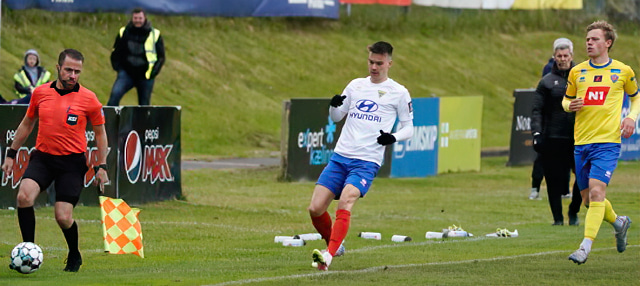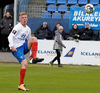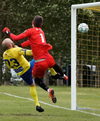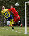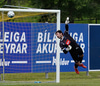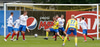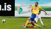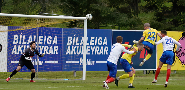 PÉTUR Í DAUÐAFÆRI! Hann fær frábæra fyrirgjöf frá Ástbirni og er aleinn á fjærstönginni, en nær engum krafti í skallann og Jajalo grípur boltann.