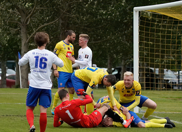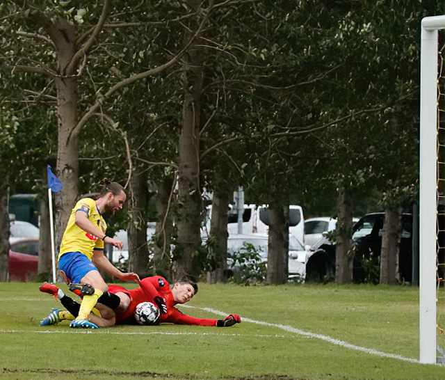KA í mjög álitlegri sókn sem að Pétur stoppar vegna höfuðmeiðsla Ástbjörns. Sem betur fer er hann heill heilsu og getur haldið áfram.