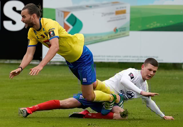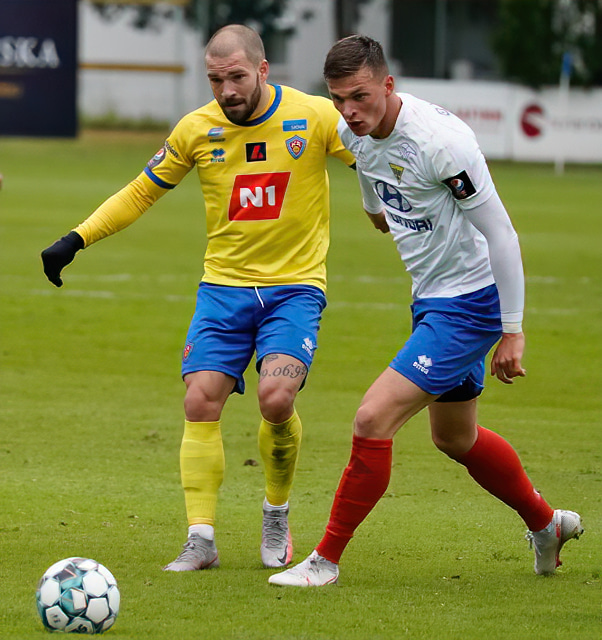 Brynjar Ingi með frábæra tæklingu! Axel virtist vera að vinna kapphlaupið við hann um boltann, sem hefði komið honum einum í gegn en Brynjar tímasetti tæklinguna fullkomlega.