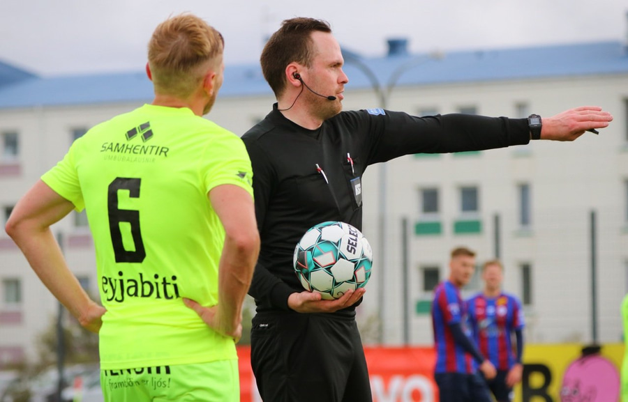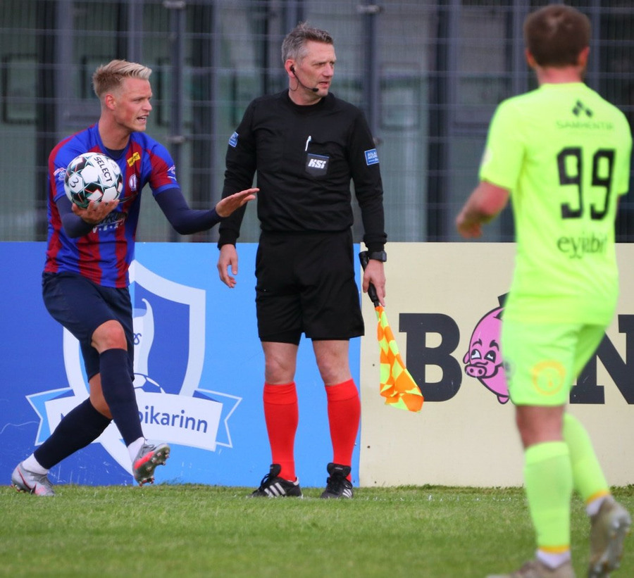 Leiknismaðurinn Danni Finns fær hér tiltal frá lögfræðinginum á flautunni. Ekkert múður hér!
