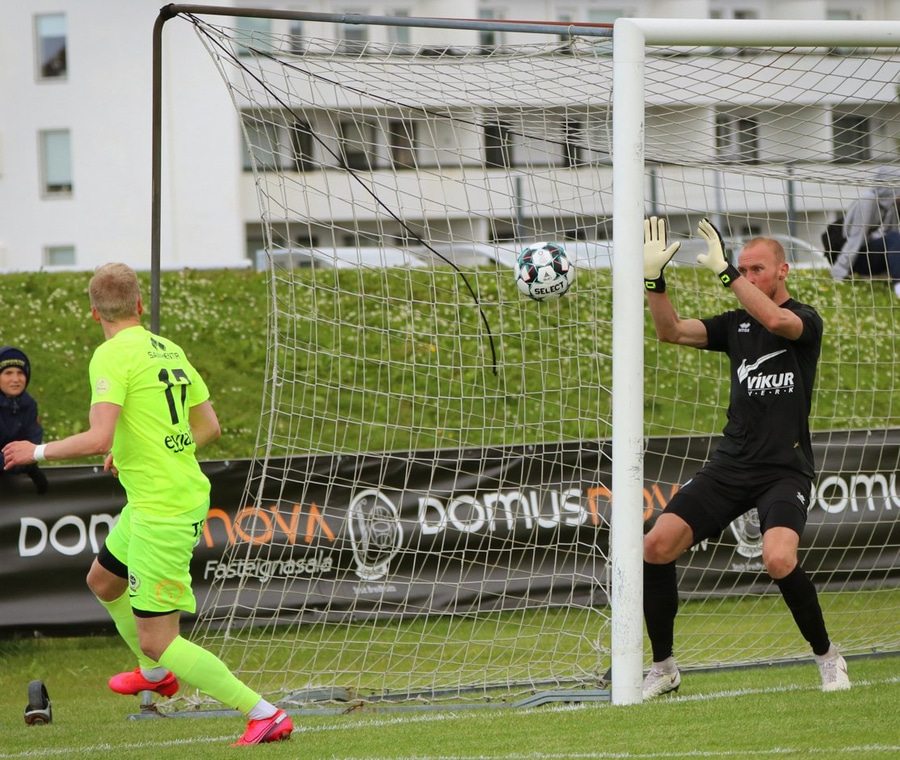 Eftir hornspyrnu er klafs í teignum og á einhvern ótrúlegan hátt bombar Magna maðurinn Baldvin Ólafsson boltanum í sitt eigið net!