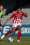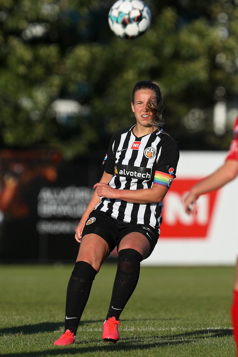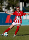 Katrín Ásbjörns rétt missir af stórhættulegri fyrirgjöf frá vinstri.