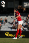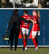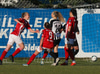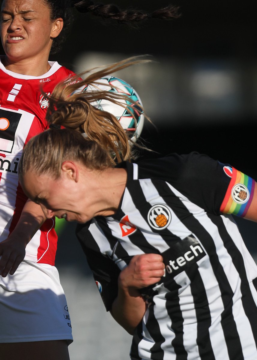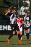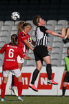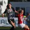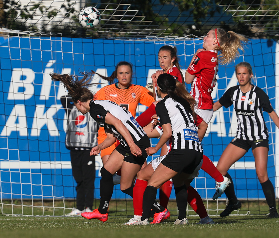 Þórdís setur háan bolta inná teig. Bæði lið berjast um boltann og eftir mikinn barning ná gestirnir að hreinsa.