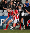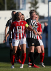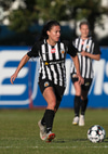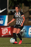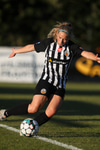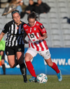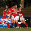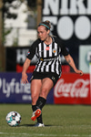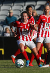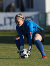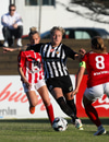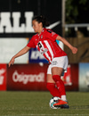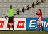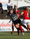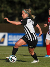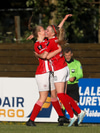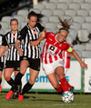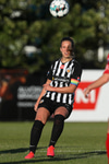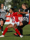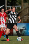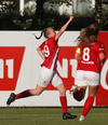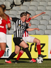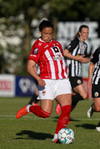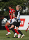 Linda Líf og Stephanie að tengja. Linda hefur betur í baráttunni við Ingunni og leggur boltann út í skot á Stephanie. Skotið er fast en framhjá!