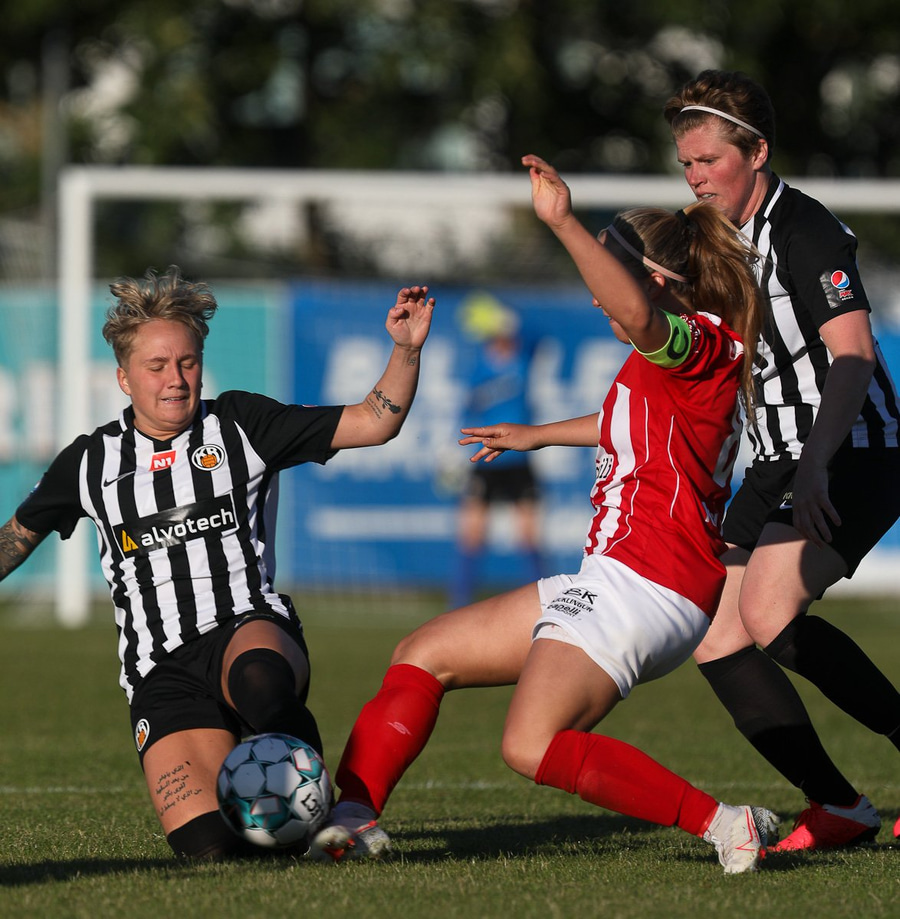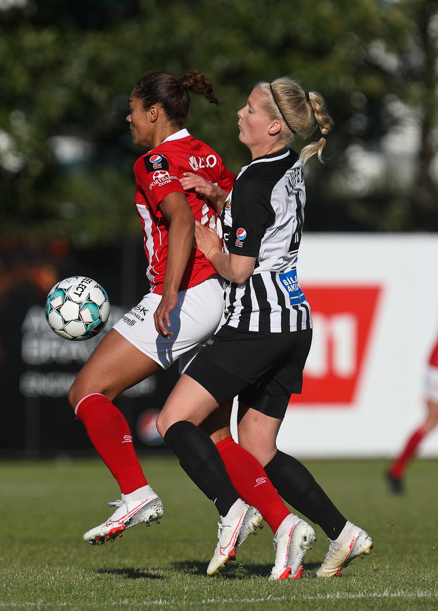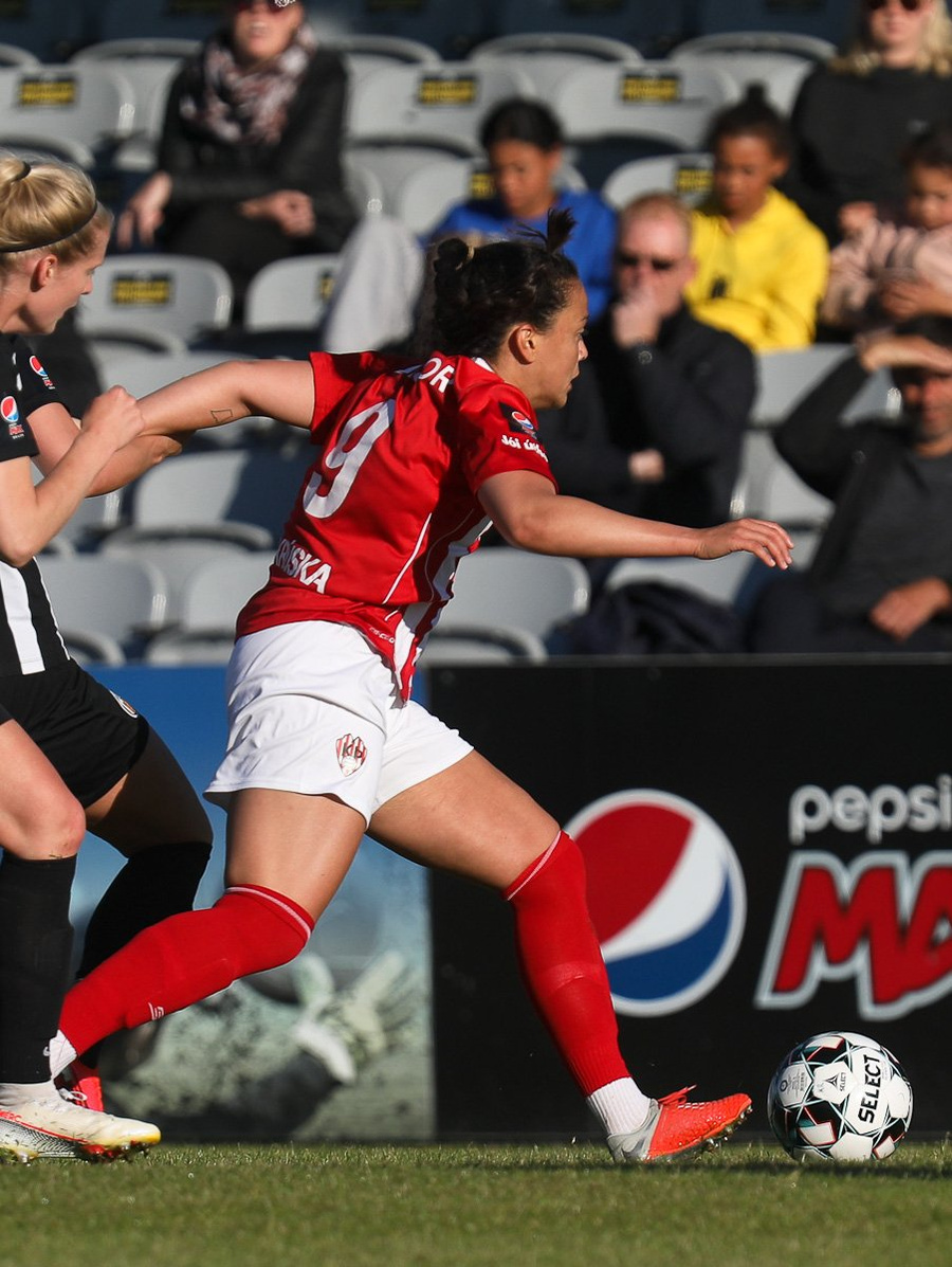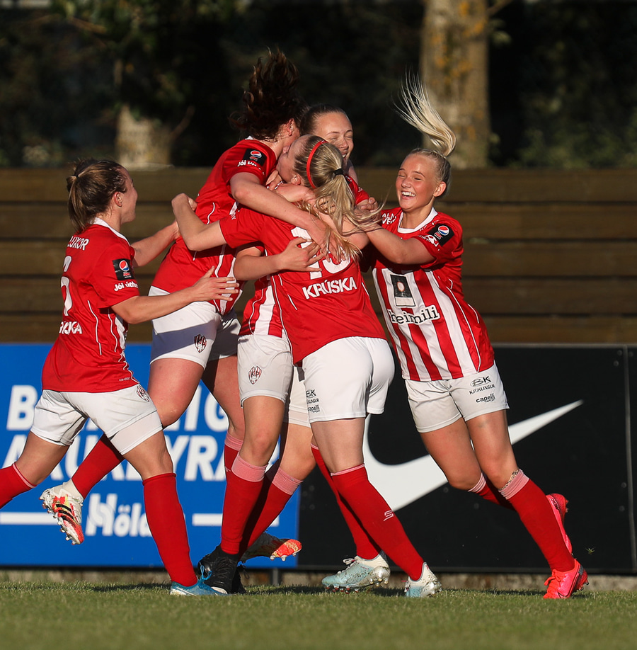 Olla mætir brakandi fersk til leiks. Hleypur Ingunni af sér, kemst inná teig með Ingunni og Laufey andandi í hálsmálið á sér en klárar vel framhjá Ingibjörgu.