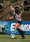 KR fær horn. Kristín Erna setur boltann fyrir á kollinn á Katrínu Ásbjörns sem skallar framhjá.