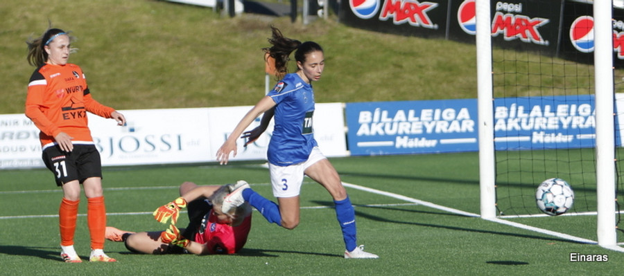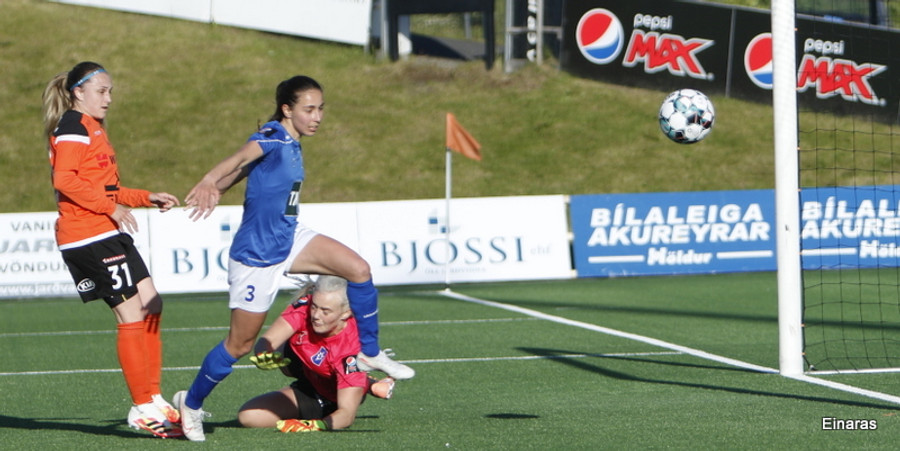 Spyrnan er góð og fer boltinn beint á kollinn á Jasmín Erlu og var ég viss um að boltinn væri á leiðinni inn þarna. En Þórdís gerir frábærlega og ver á línu