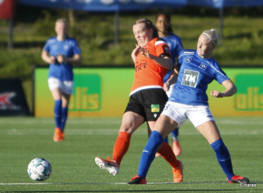 Vá það er bara vont að horfa á þetta, Birta missir mjög klaufalega af boltanum og þá ætlar að Arna Dís að hreinsa en hittir ekki boltann.