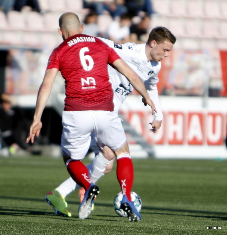 Daði Ólafs hleypur upp völlinn og kemst inn á teiginn þar sem hann fer niður í baráttunni við Sebastian. Einar Ingi dæmir ekkert, en Sebastian liggur eftir.