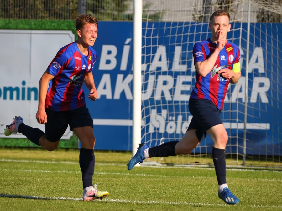 Dagur Austmann með lúmskan bolta fyrir markið sem Sævar reynir að skalla með því að beygja sig niður. Boltinn þó yfir hann og ekki langt framhjá fjærstönginni. Fínasta hugmynd og Brynjar alls ekki viss.