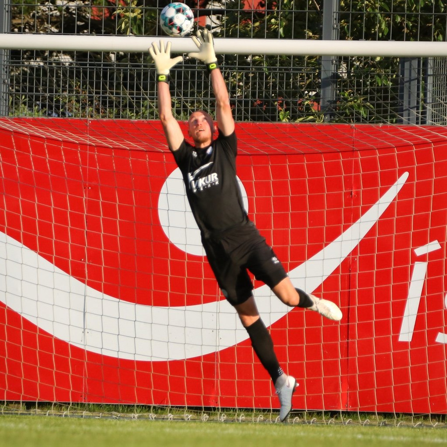 Slakur bolti frá marki Leiknis sem Gonzalo hirðir og keyrir í átt að marki og nær skotinu en í varnarmann og afturfyrir.