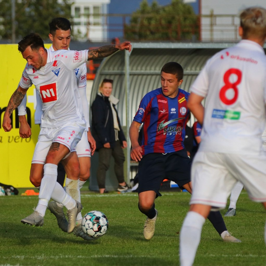 Vuk með skot í varnarmann en Arnór fylgir vel á eftir og hamrar boltann beint uppí samúel úr teignum