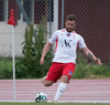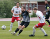 Elmar fær boltann í bakið og sendir Kairo á sprett. Loftur og Hermann stöðva þessa sókn inn á teignum með því að renna sér fyrir skot frá Kairo.