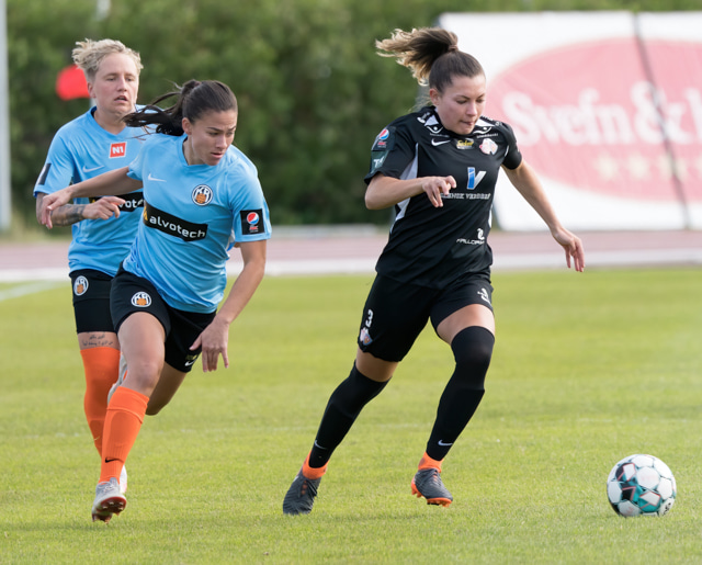 Thelma Lóa á ekki í vandræðum með að hlaupa Huldu Björgu af sér og leggur boltann til vinstir á Angelu Beard. Hún neglir að marki en skot hennar fer framhjá.