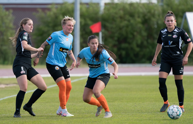 Hulda Ósk fær sendingu inn fyrir sem Ana Cate misreiknar, en skot Huldu er með veikari fætinum og fer langt framhjá. Það er að lifna yfir þessu!