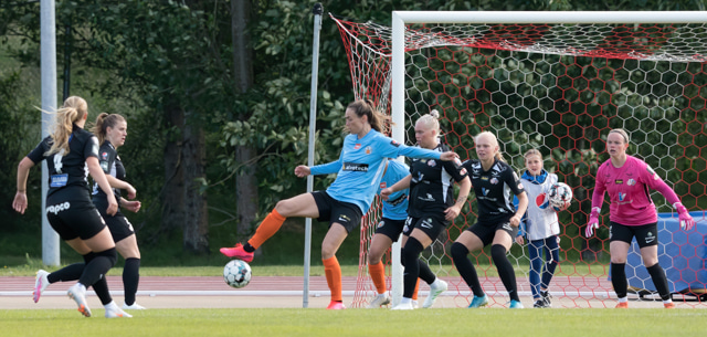 Rakel Sjöfn í góðu færi! Margrét fær boltann á hægri kantinum, kemur boltanum á Maríu sem fleytir boltanum áfram á Rakel. Rakel skýtur að marki en boltinn fer yfir.