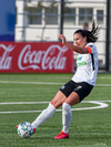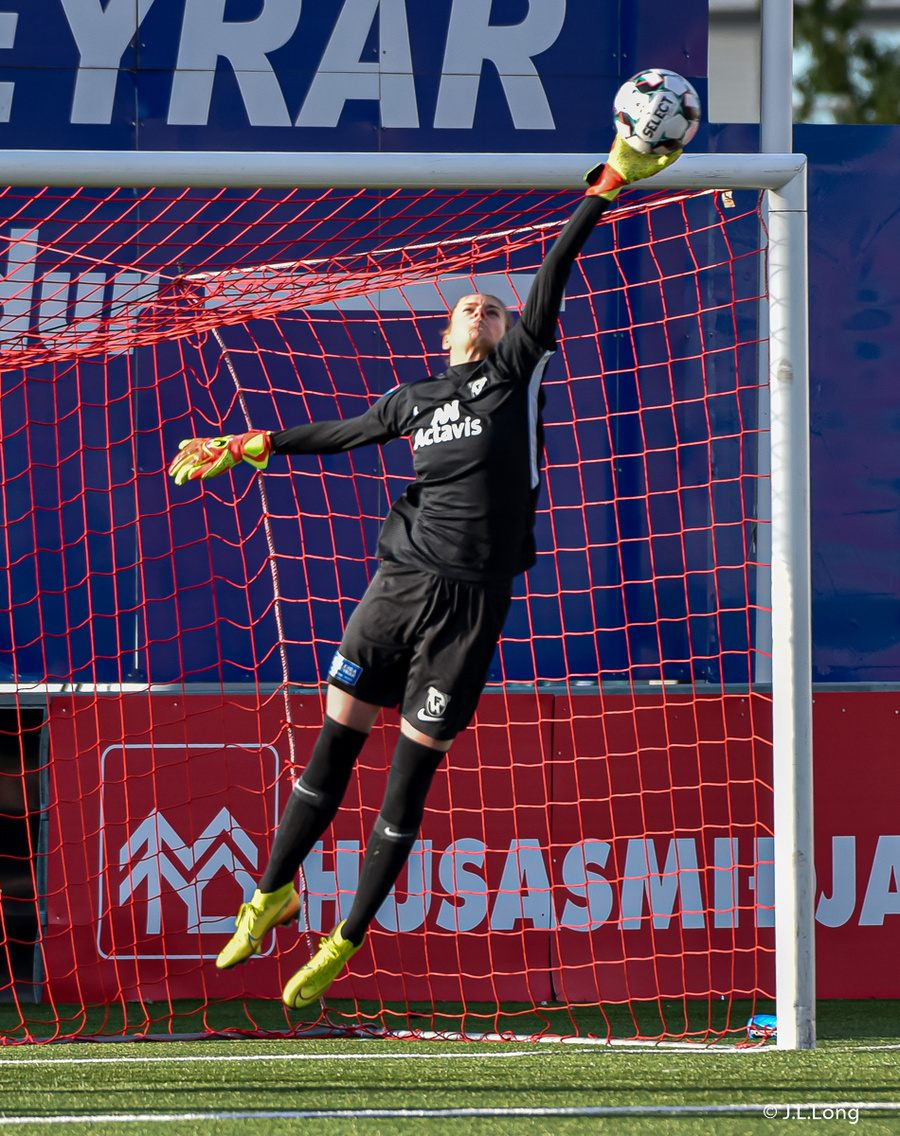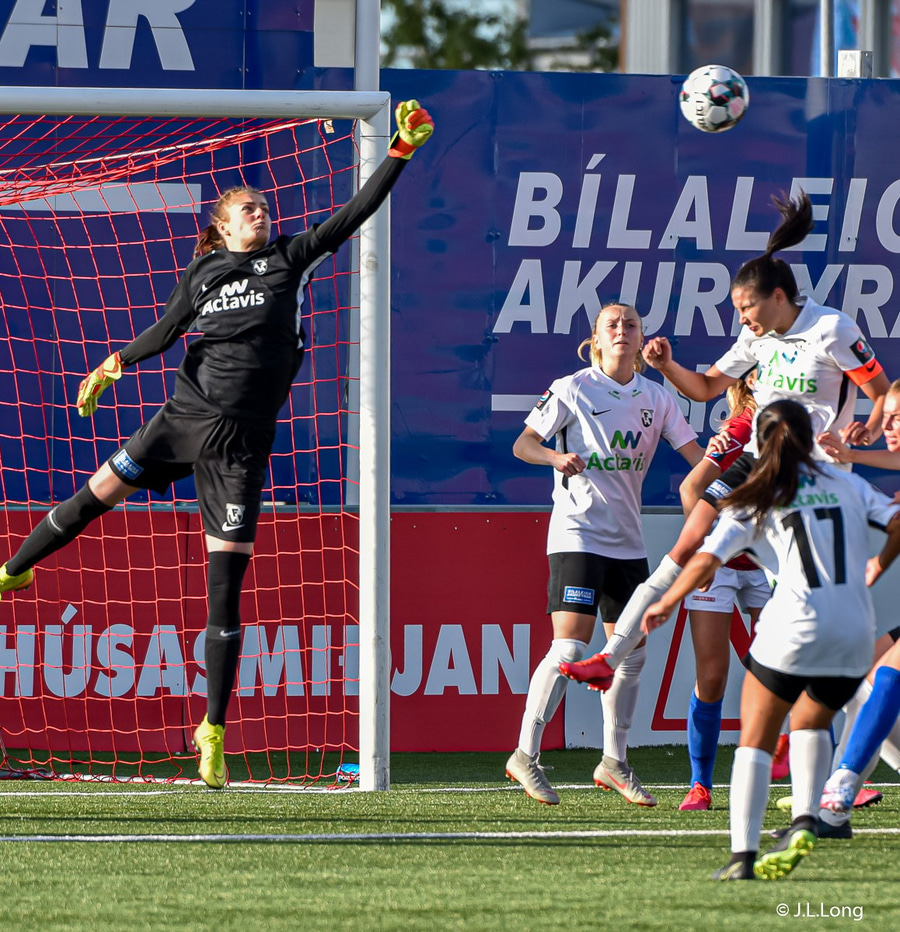 Spyrnan mjög góð en Telma vel vakandi, mætir út og grípur þennan bolta.