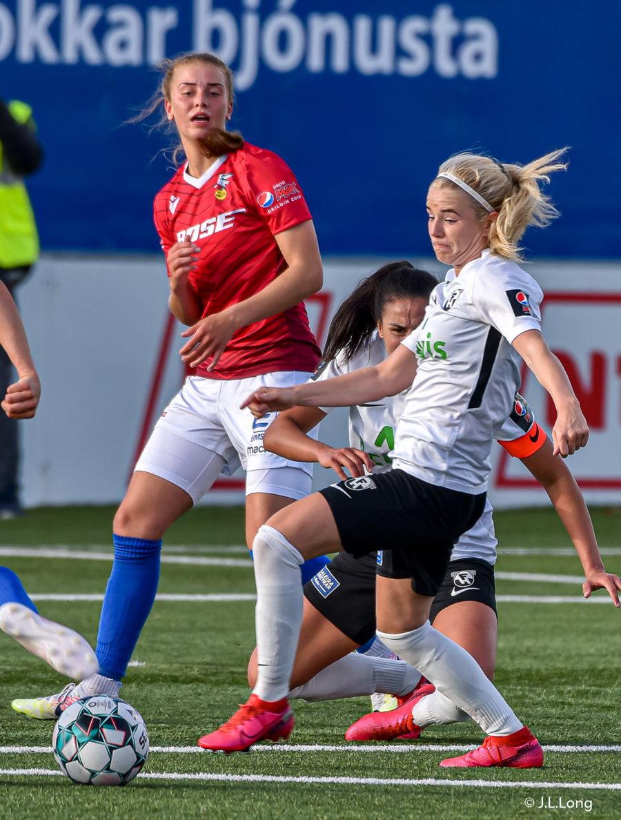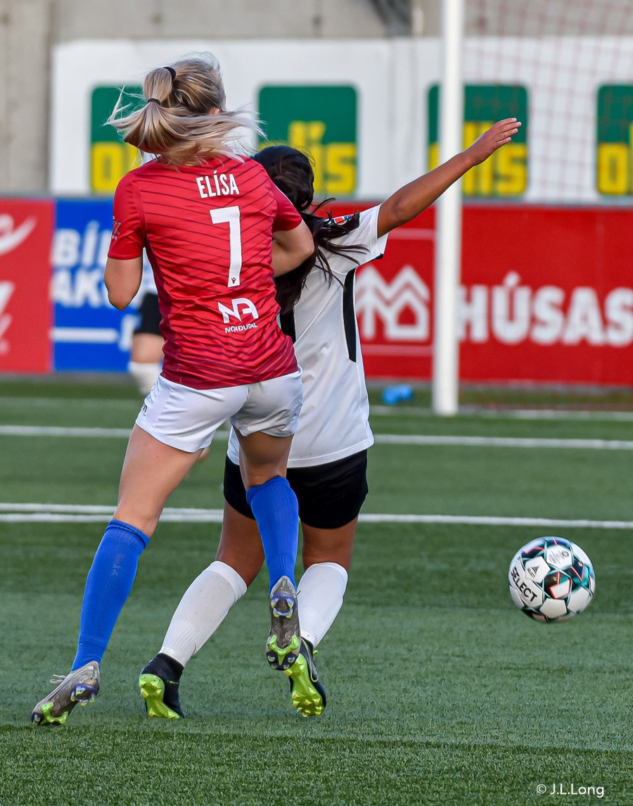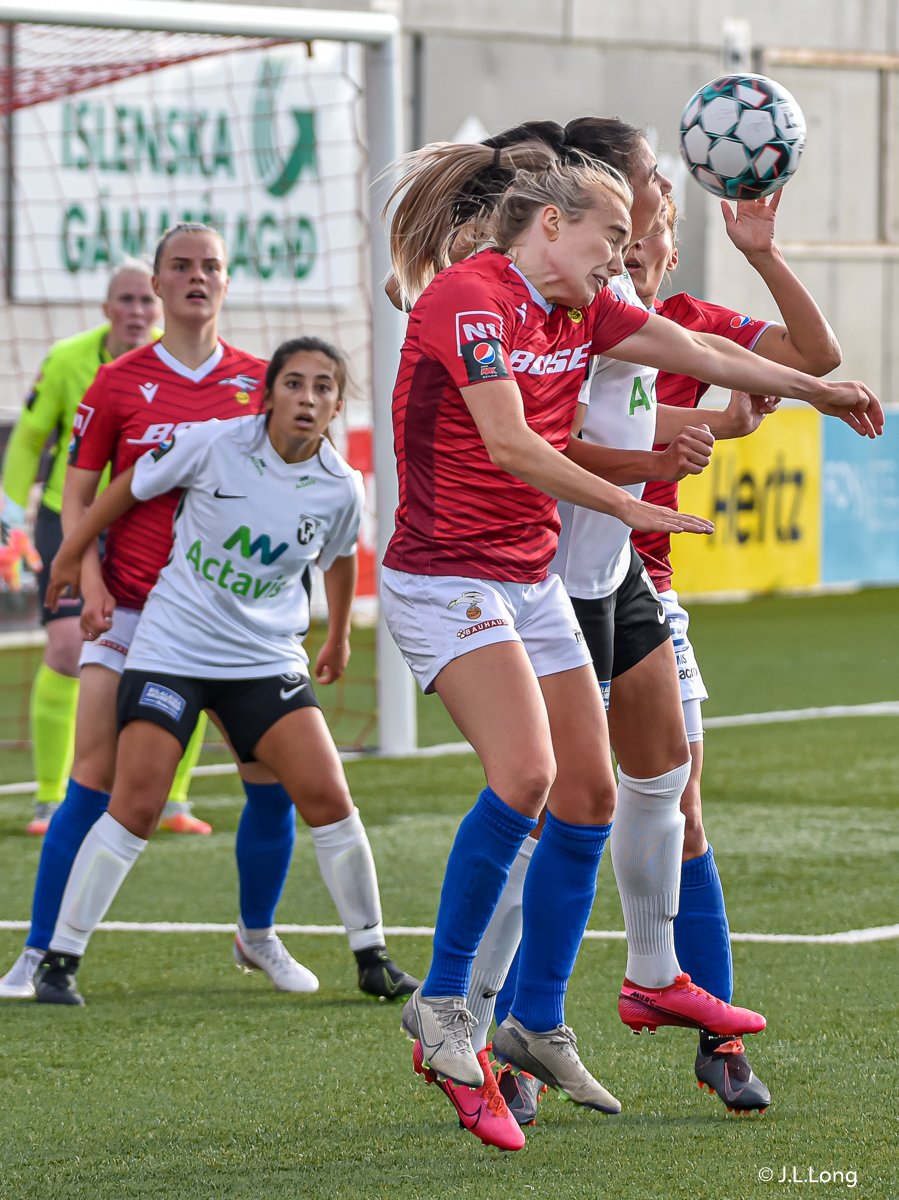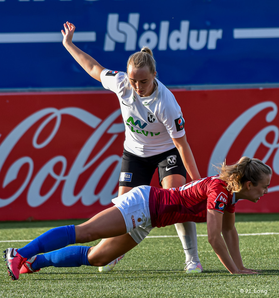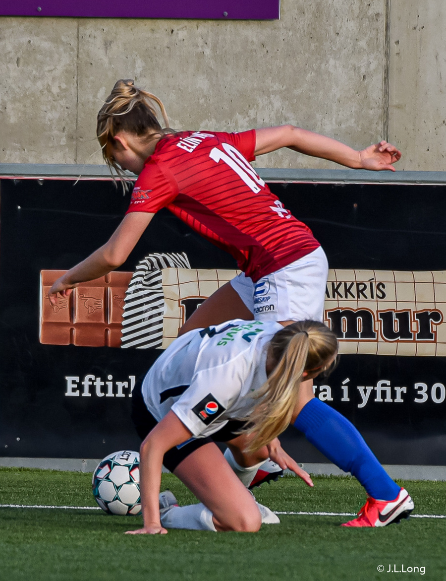 Elín Metta fór á fullri ferð upp kantinn en Ingibjörg mætir henni. Elín Metta reynir að leika á hana en Ingibjörg sparkar boltanum í Elínu og aftur fyrir.