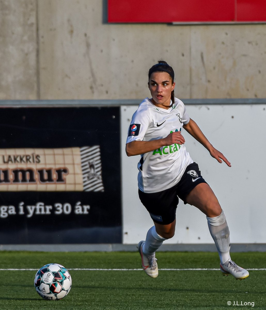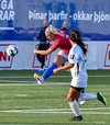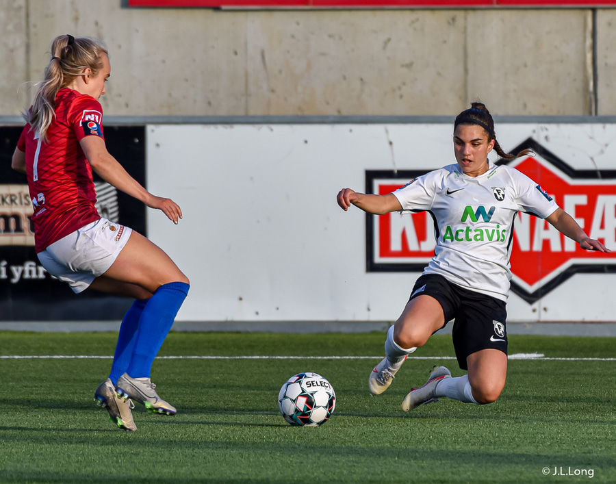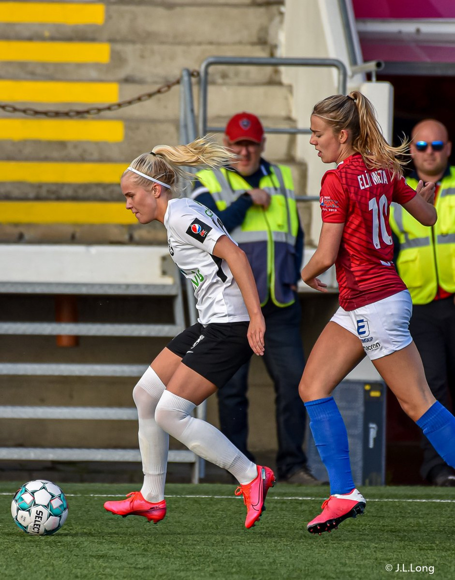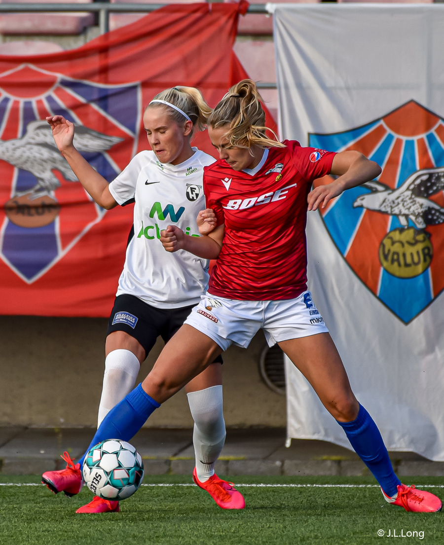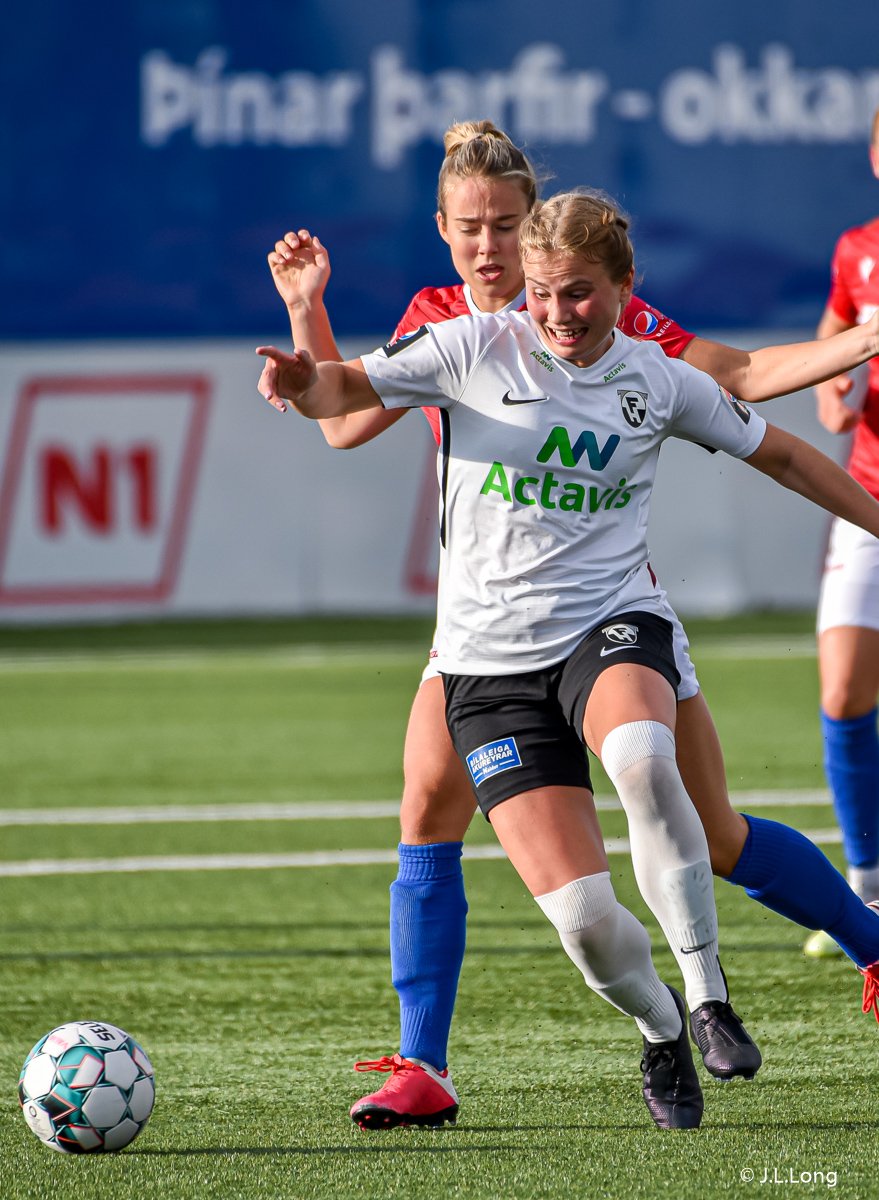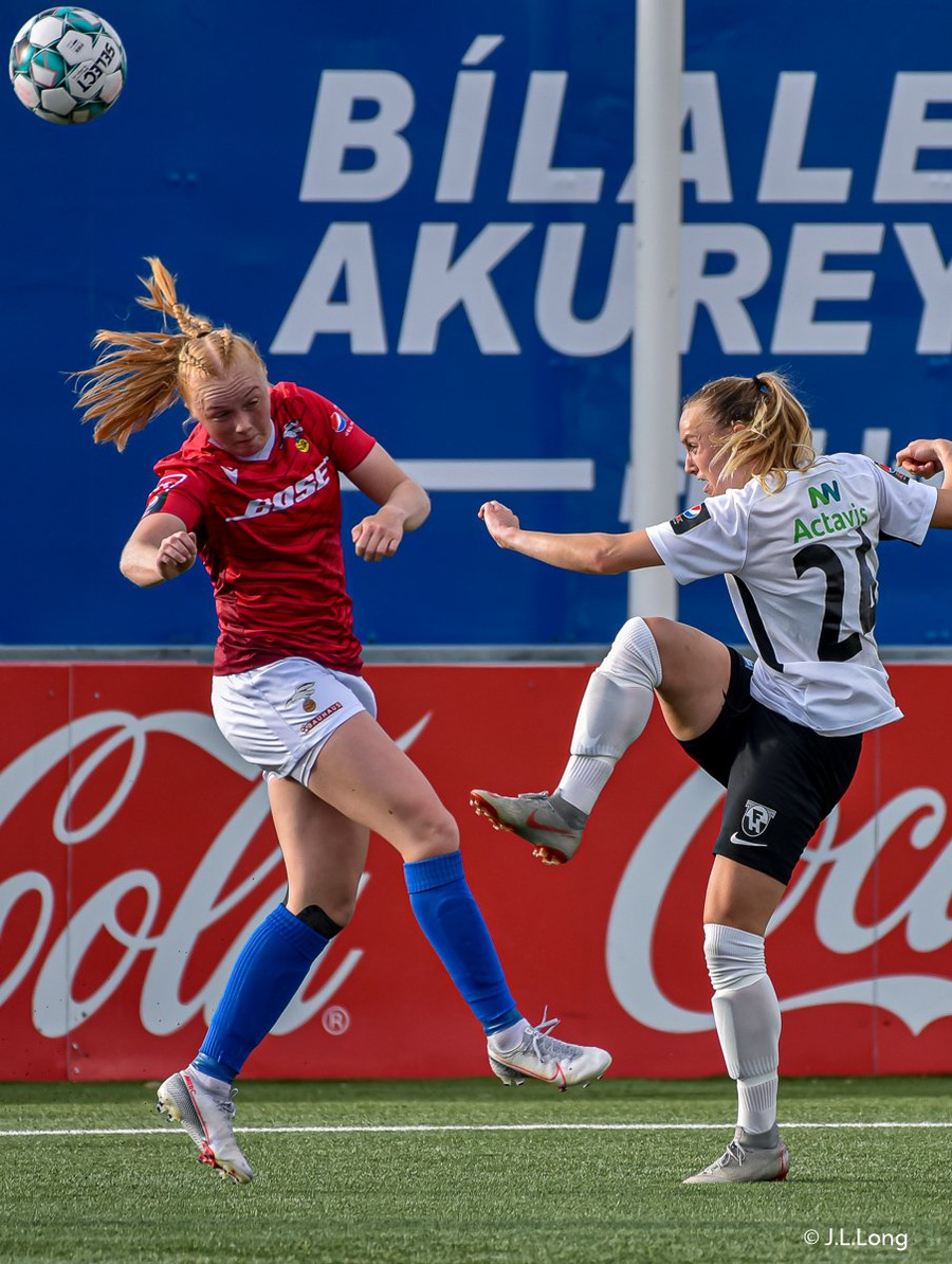 Elín Metta fór á fullri ferð upp kantinn en Ingibjörg mætir henni. Elín Metta reynir að leika á hana en Ingibjörg sparkar boltanum í Elínu og aftur fyrir.