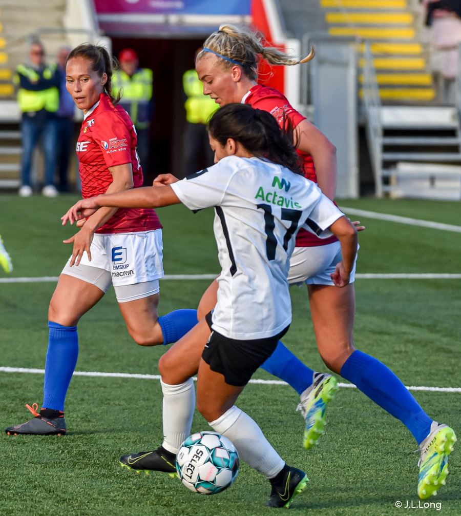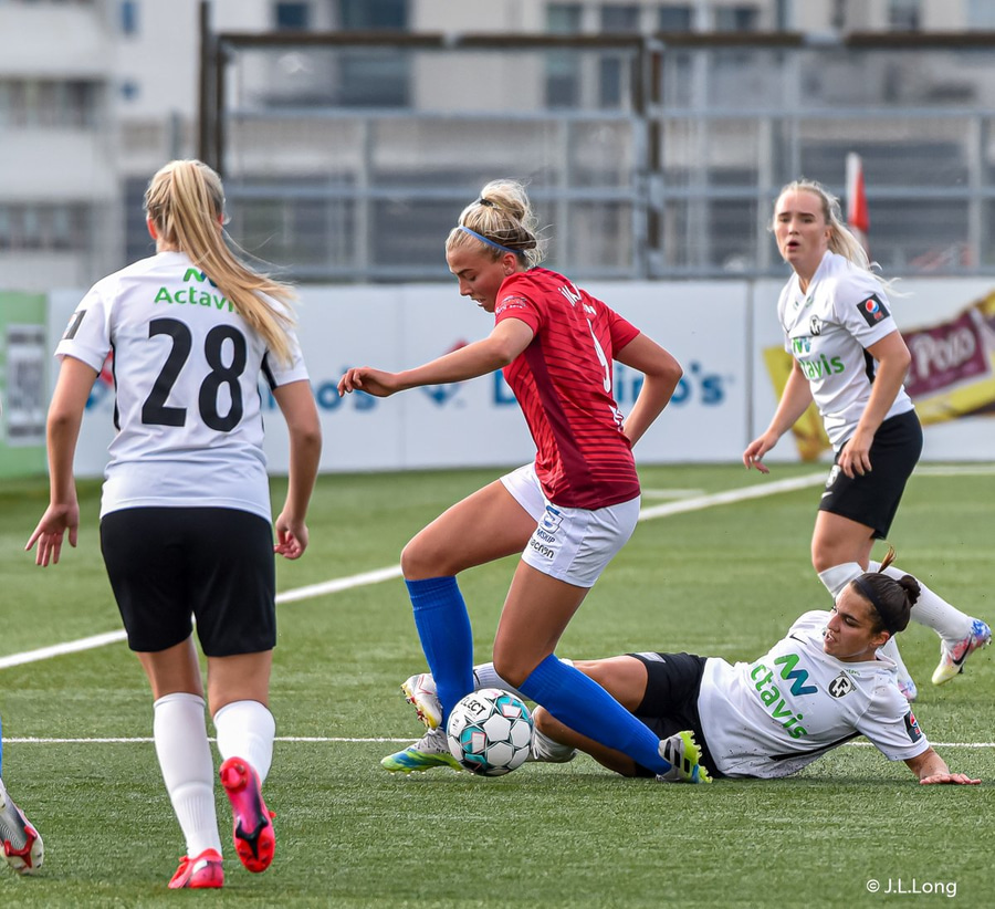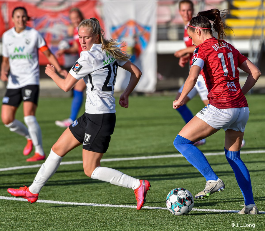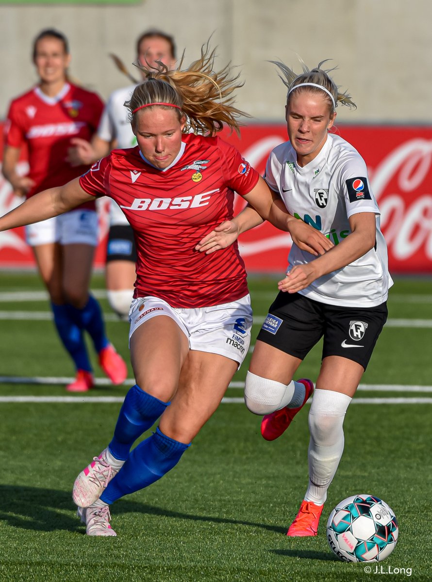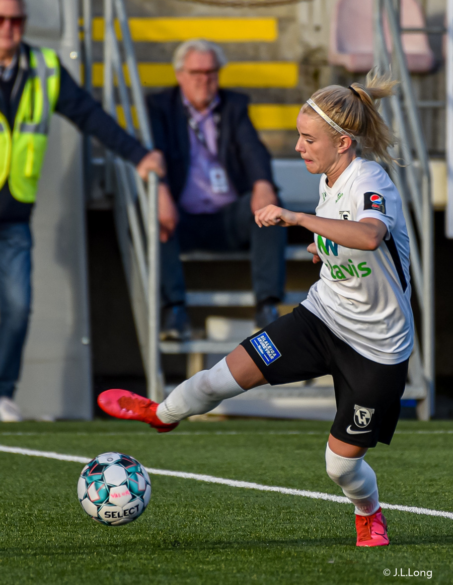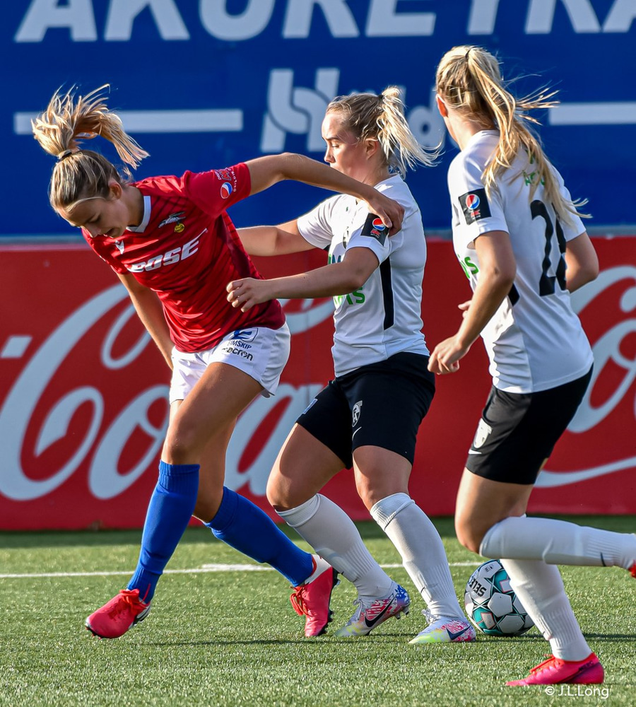 Elín Metta fór á fullri ferð upp kantinn en Ingibjörg mætir henni. Elín Metta reynir að leika á hana en Ingibjörg sparkar boltanum í Elínu og aftur fyrir.
