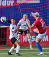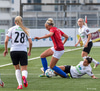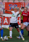 Guðný Árna orðin fremsti maður kemur með fyrirgjöf en FH tækla frá.