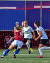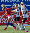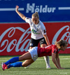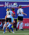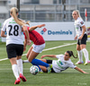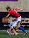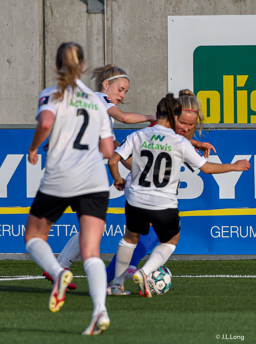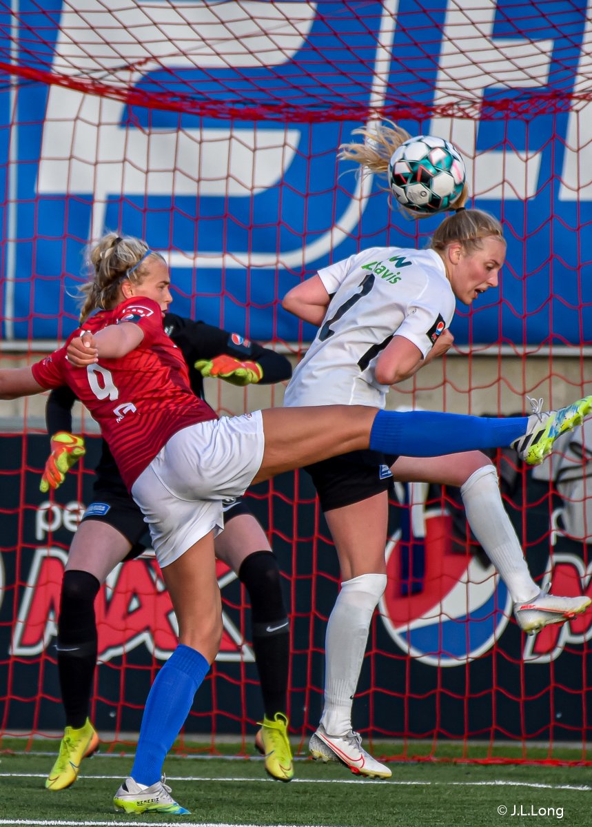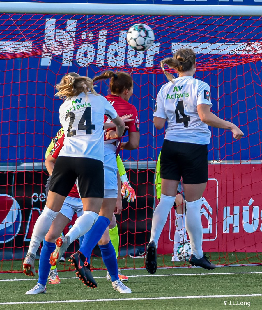 Bergdís klobbar hér Valgerði en Taylor bjargar henni og kemur boltanum í horn.