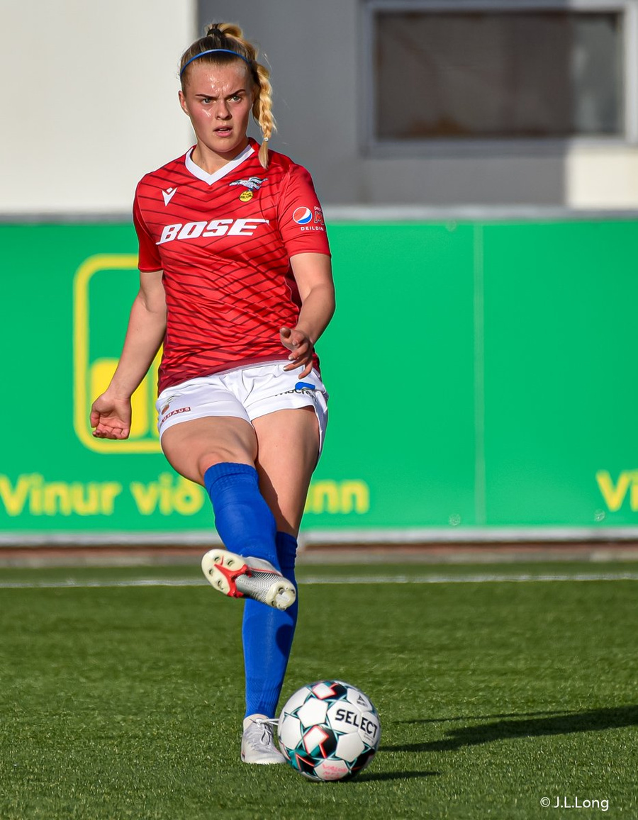 Hallbera tekur langan inn á teiginn en telma kýlir frá. Þar er hinsvegar Elín Meta mætt og skýtur á markið en boltinn yfir.