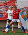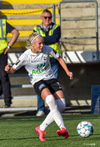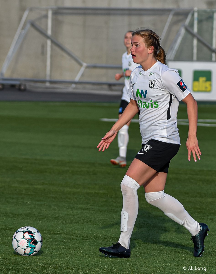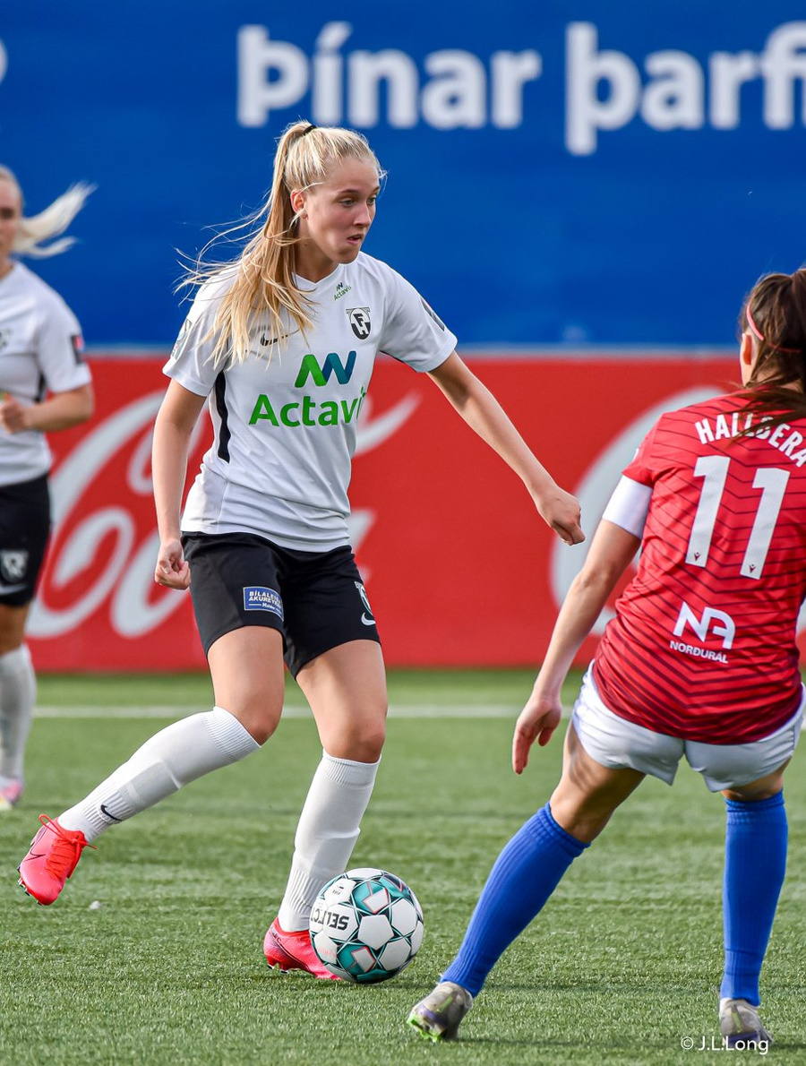 Brotið á Elín Mettu þegar hún reynir snúninginn, þetta er á ágætis stað fyrir Hallberu til að koma boltanum inn í.