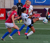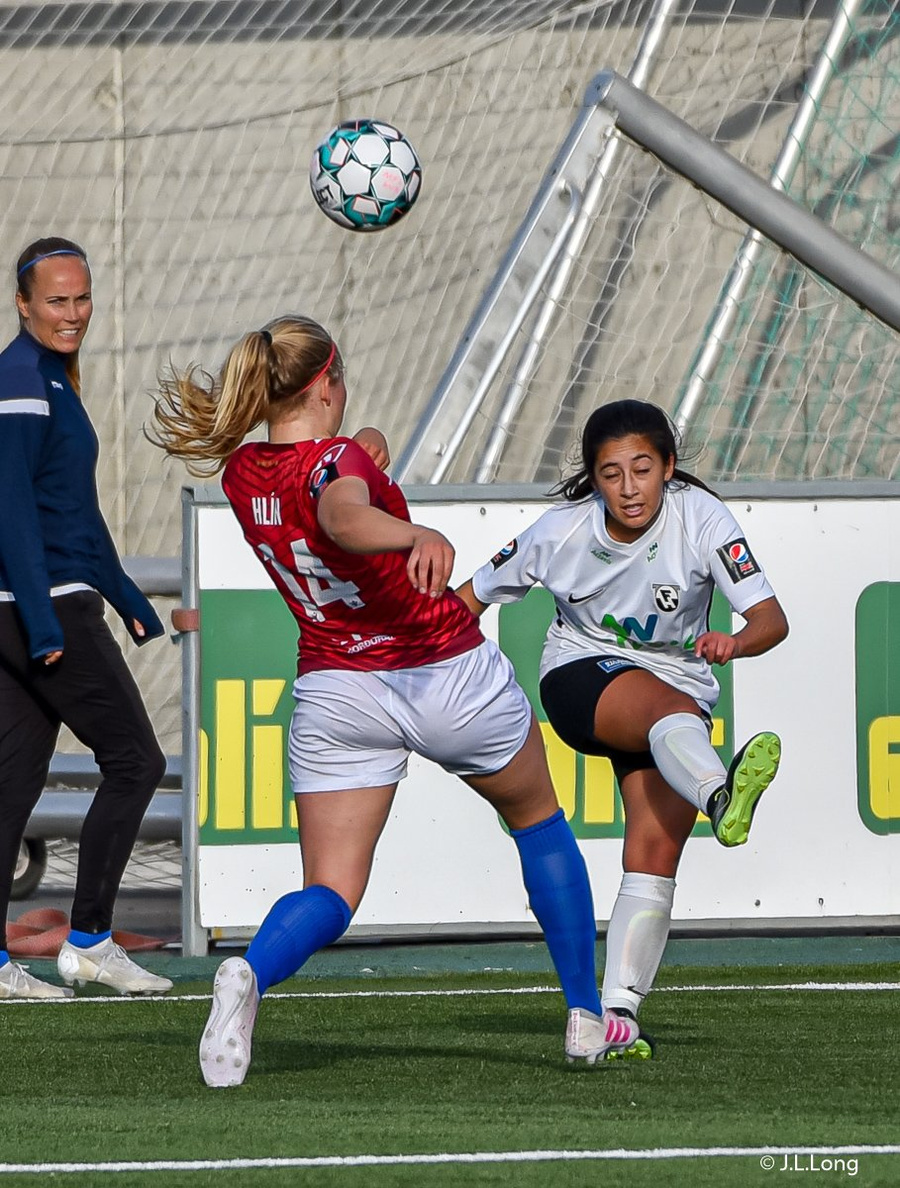 Hlín leikur á Hrafnhildi á hægri kantinum og sendir fyrir en boltinn í horn.