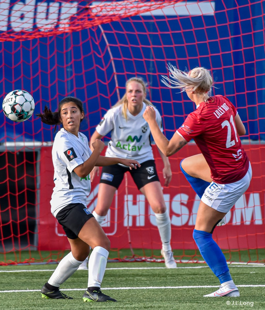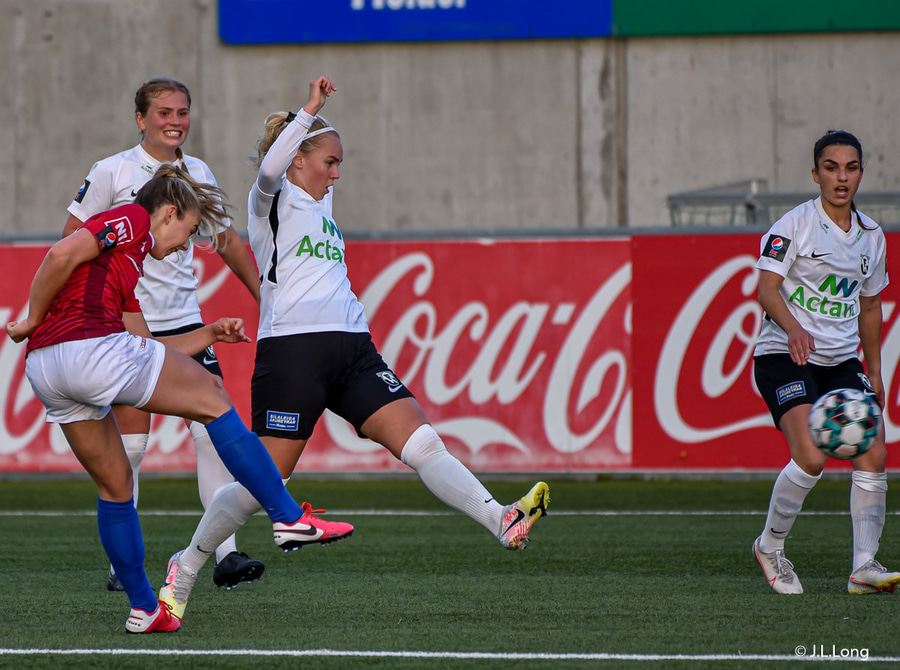 Hallbera með hornspyrnu og boltinn dettur alveg við fjarstöng, þar setur Lillý tánna í boltann og fram hjá.