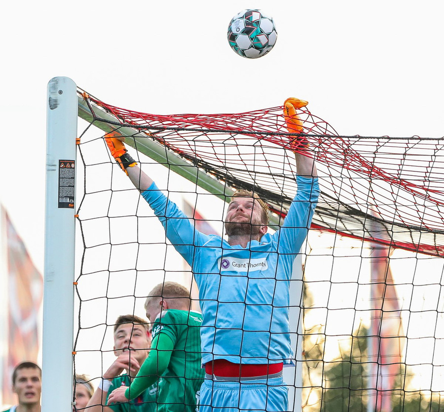 Setti boltann á mitt markið á meðan Ingvar skutlaði sér til hliðar.