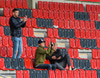 Rafmagnið er komið á og Viðar Helgason eftirlitsmaður er búinn að fá sér sæti í stúkunni. Það verður mjög fámennt en góðmennt á Heimavelli hamingjunnar í kvöld.