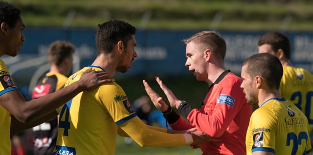 Tryllist á bekknum þegar dæmt er á Ívar. Skagamenn vildu seinna gula spjaldið en KA menn vildu meina að þetta væri ekkert. Branislav sparkar í skilti og lætur nokkur vel orð falla.