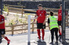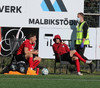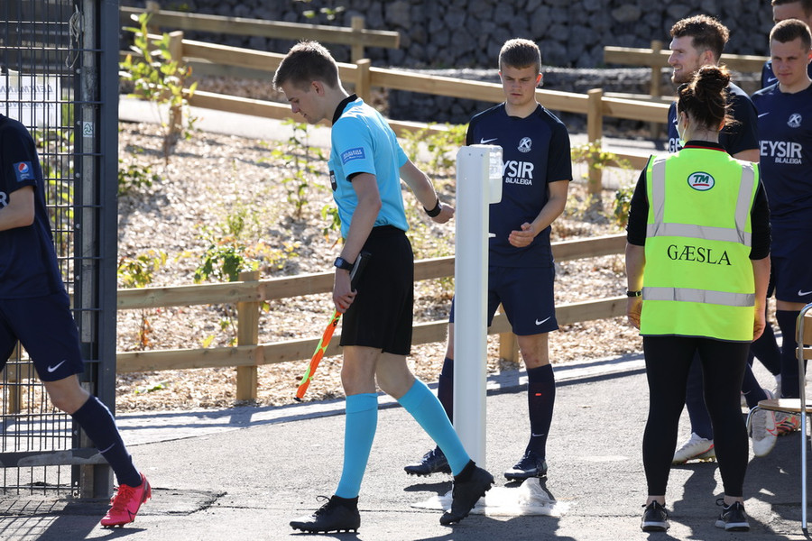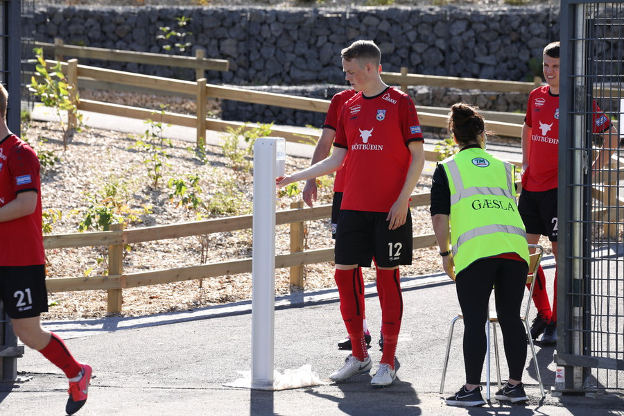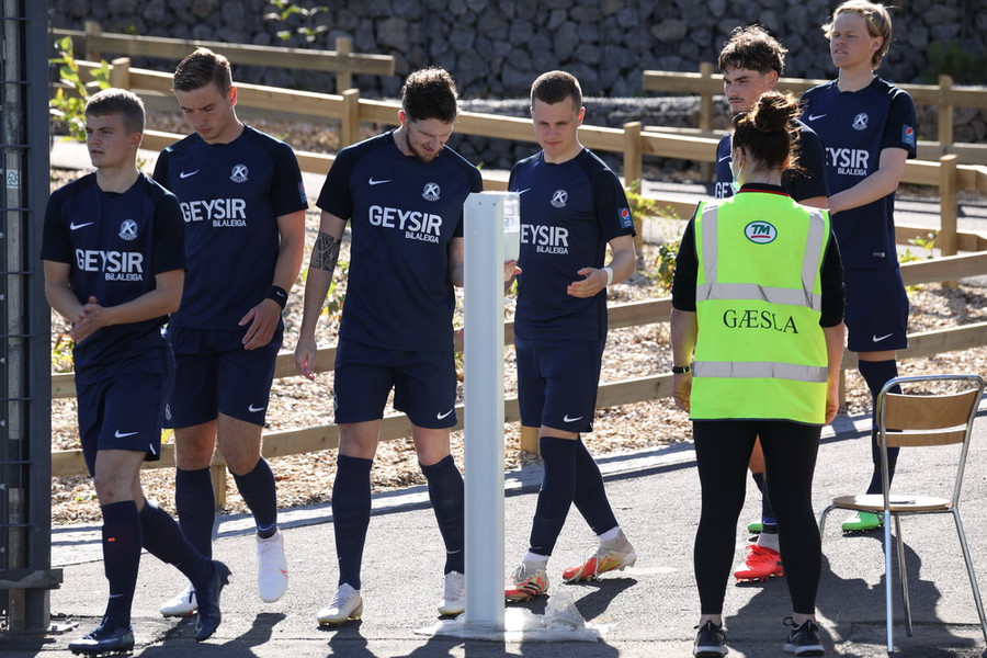 Liðin hafa lokið upphitun og því styttist í leik! Aðstæður eru upp á 10 hér í Mosfellsbæ í dag. Vel vökvað gervigras, sól og logn.
