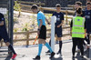 Liðin ganga hér inn á völlinn og Kaleo hljómar í hljóðkerfinu.