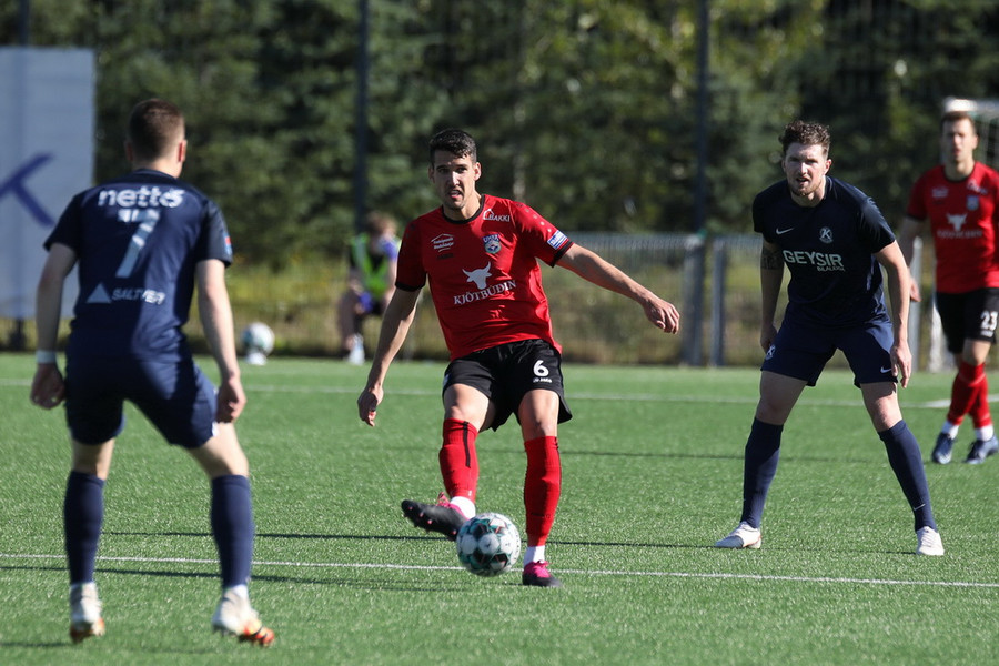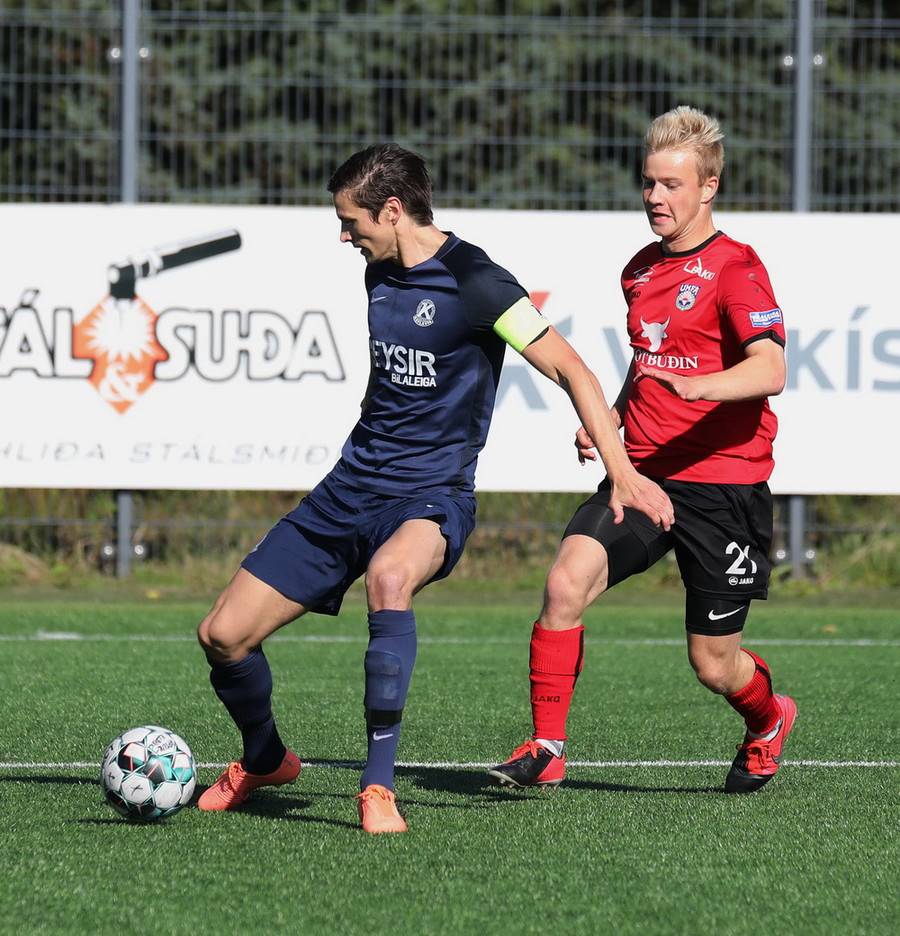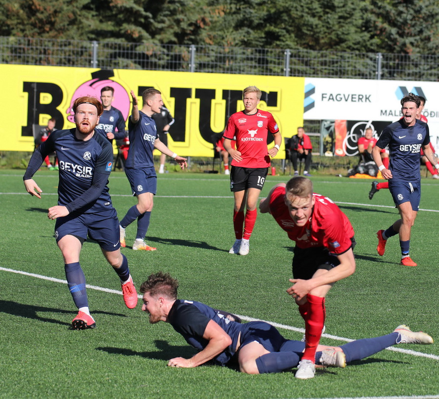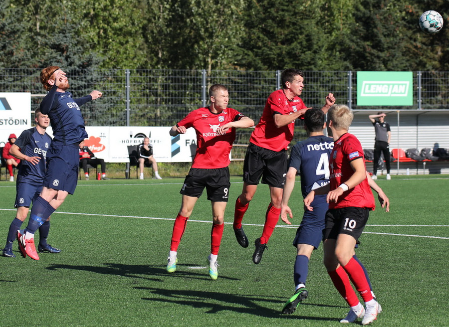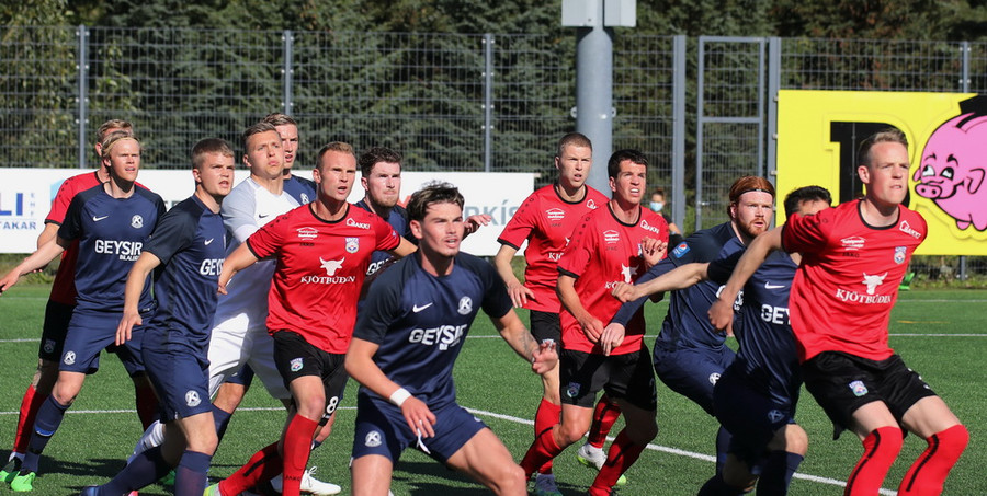 Horspyrnan fer yfir pakkann en Hafliði setur botann aftur fyrir og þar skallar Endika framhjá marki gestana.