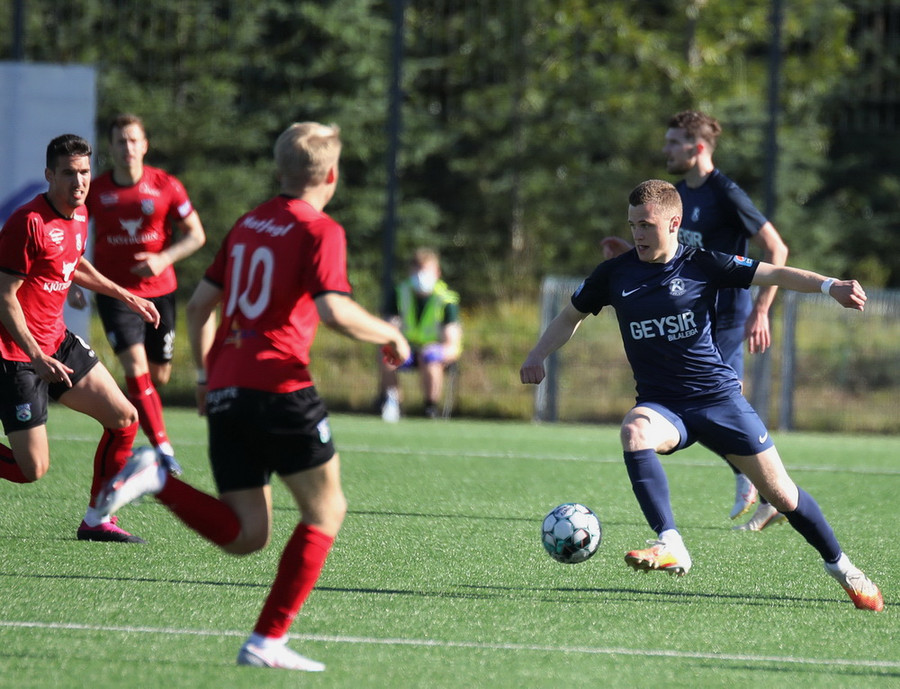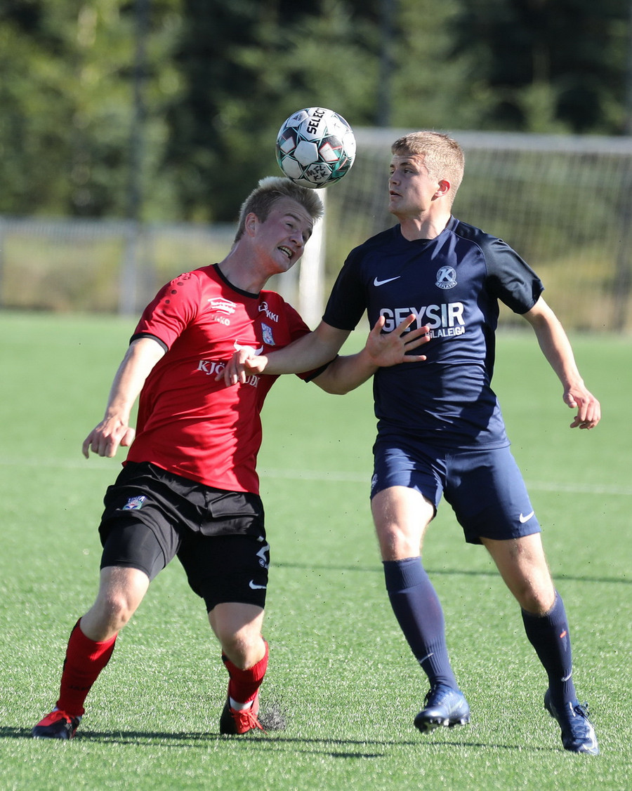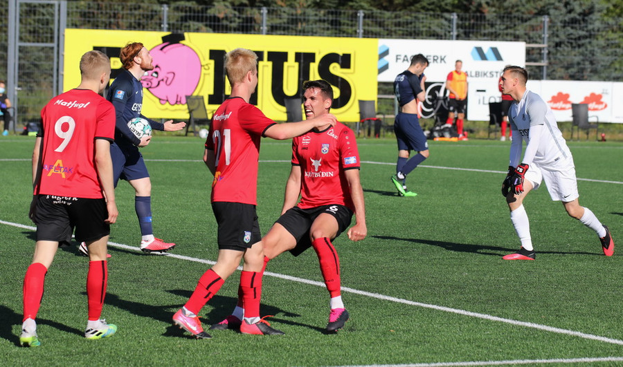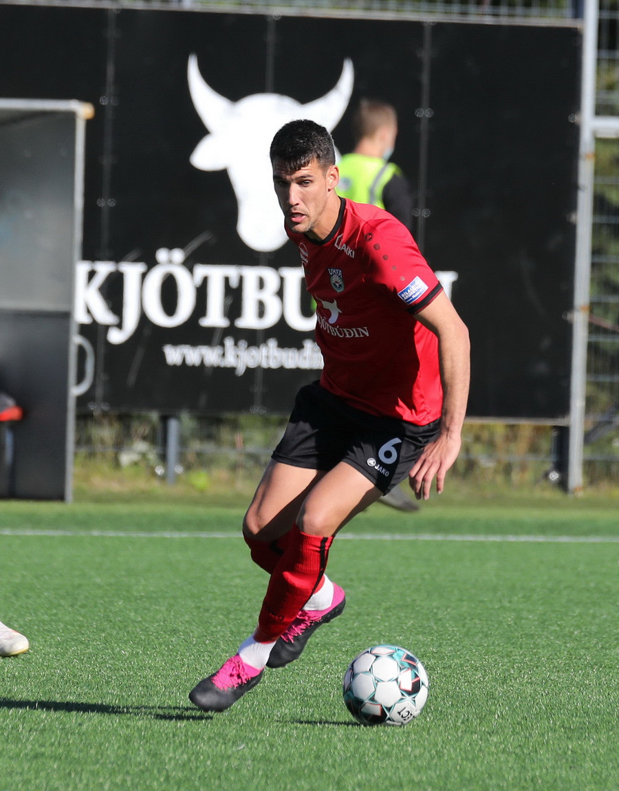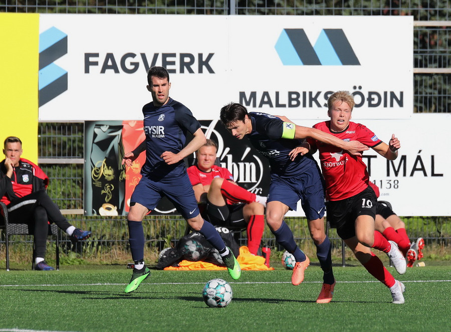 Horspyrnan fer yfir pakkann en Hafliði setur botann aftur fyrir og þar skallar Endika framhjá marki gestana.
