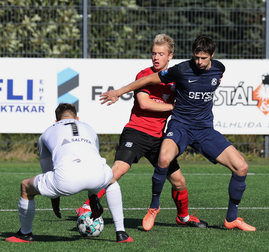 Vel spilað hjá Andra og Kristjáni. Boltinn berst fyrir og þar kemur Hafliði. Hann hittir boltann vel en Sindri með geggjaða vörslu!!