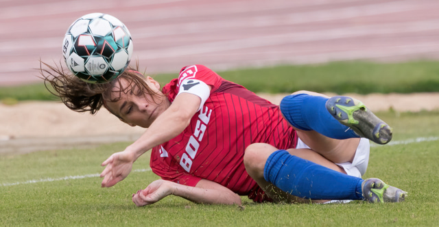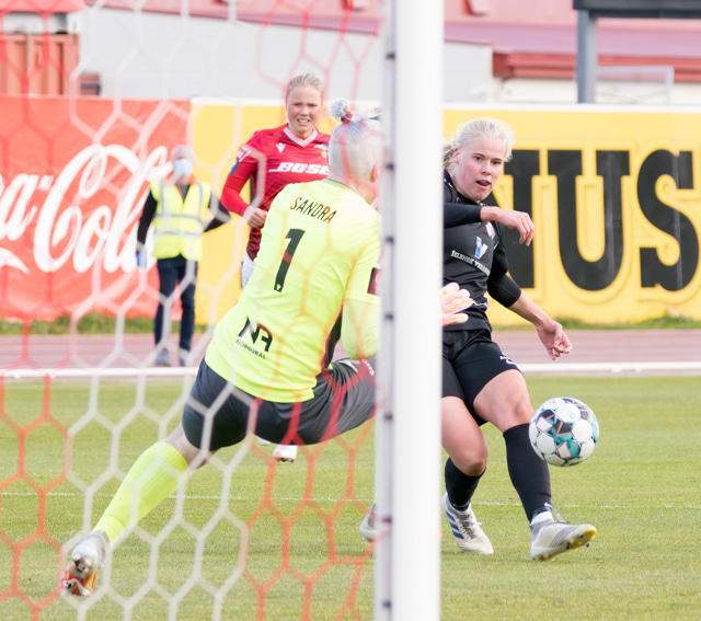 Hulda Ósk nálægt því að fá boltann í gegn en Sandra vel vakandi og mætir út á móti.
