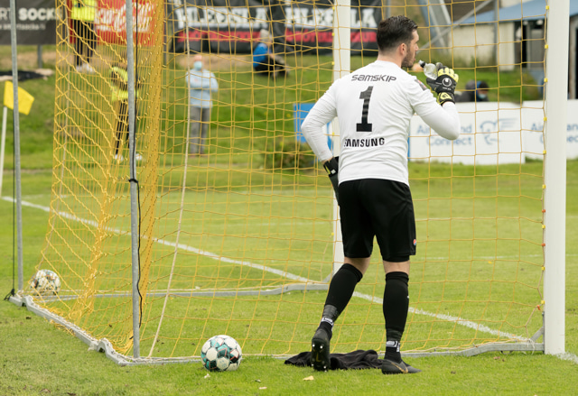 Jósef með glæfralega sendingu til baka á Halla í markinu innan teigs. Ásgeir kemst á milli og nær til boltans. Halli gerir hins vegar vel markinu, gerir sig breiðan og ver. Dauðafæri!