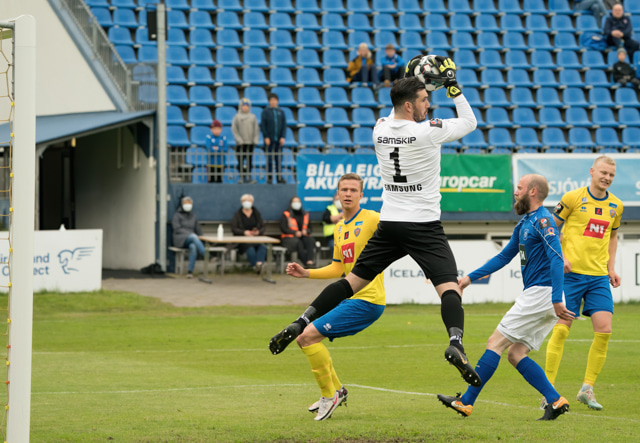 Hallgrímur með gott skot fyrir utan teig sem Halli þarf að hafa fyrir að verja í markinu.